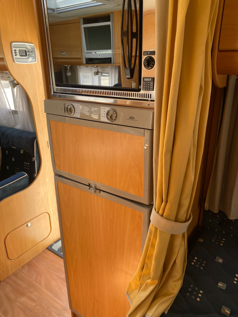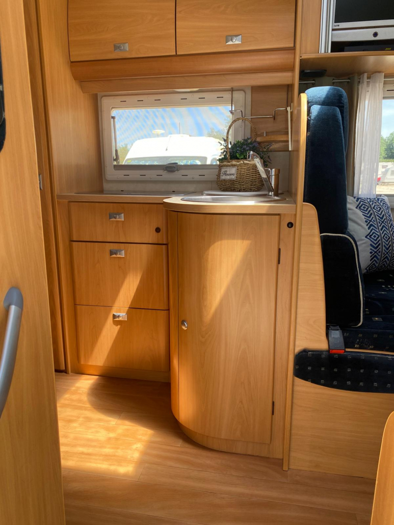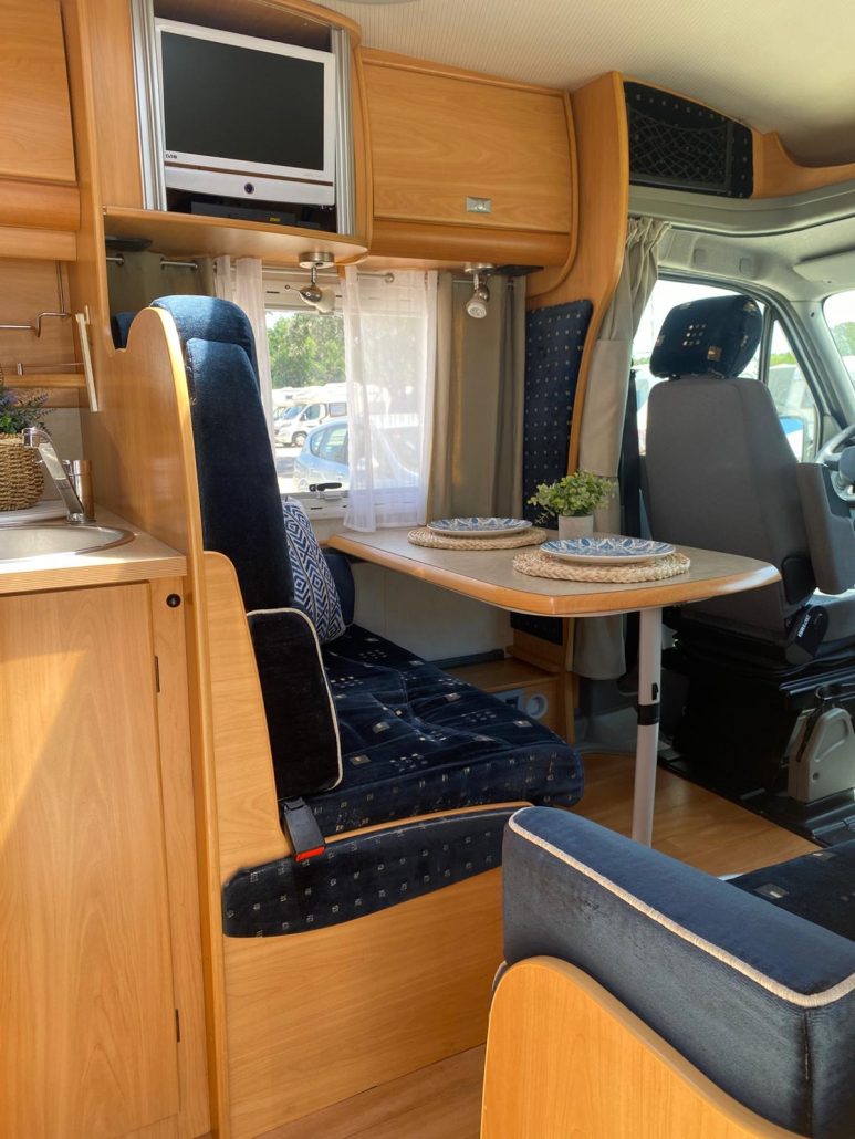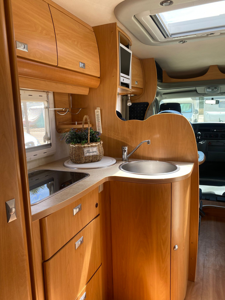 Diseño interior muy funcional que maximiza el espacio y la comodidad: Capacidad para 5 personas (viaje y pernocta). Cama francesa fija trasera, amplia y cómoda. Cama convertible en salón, perfecta para invitados o familia. Zona de comedor espaciosa y luminosa. El interior se encuentra en excelente estado de conservación, con tapicerías y mobiliario muy bien cuidados. Pensada para ofrecer total autonomía durante tus viajes: Fregadero de acero inoxidable. Cocina de gas con varios fogones. Horno integrado, frigorífico grande. Amplios espacios de almacenamiento. Cuarto de baño independiente. Ducha separada, aportando mayor comodidad. WC y lavabo en perfecto estado.