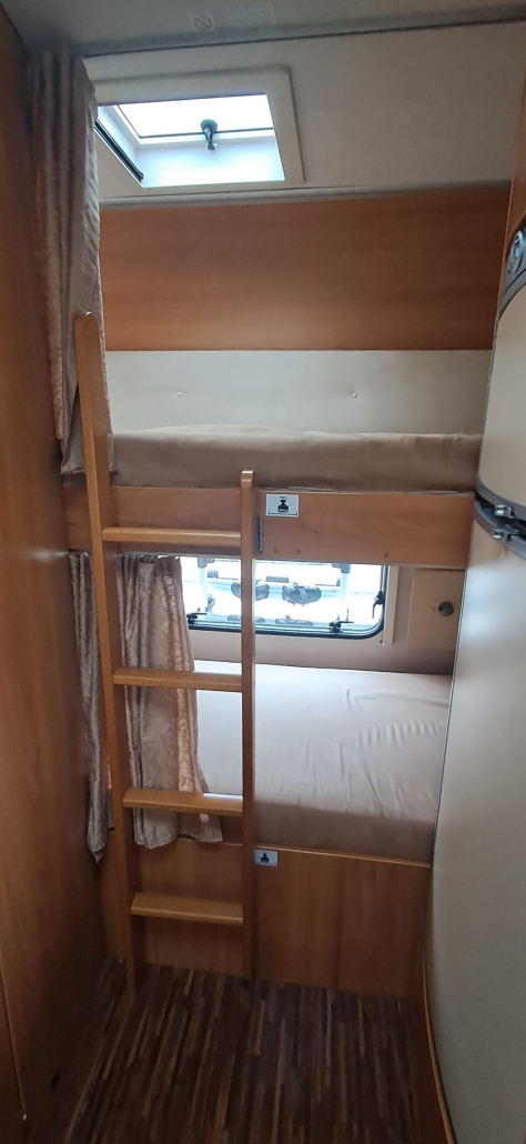 Zona de descanso con cama transversal y literas, proporcionando varias opciones para dormir cómodamente.