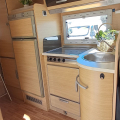 La zona de descanso está diseñada para garantizar confort, con camas amplias y soluciones prácticas de almacenaje. La cocina, totalmente equipada, cuenta con fuegos, fregadero y frigorífico, permitiendo preparar comidas con total autonomía durante el viaje.