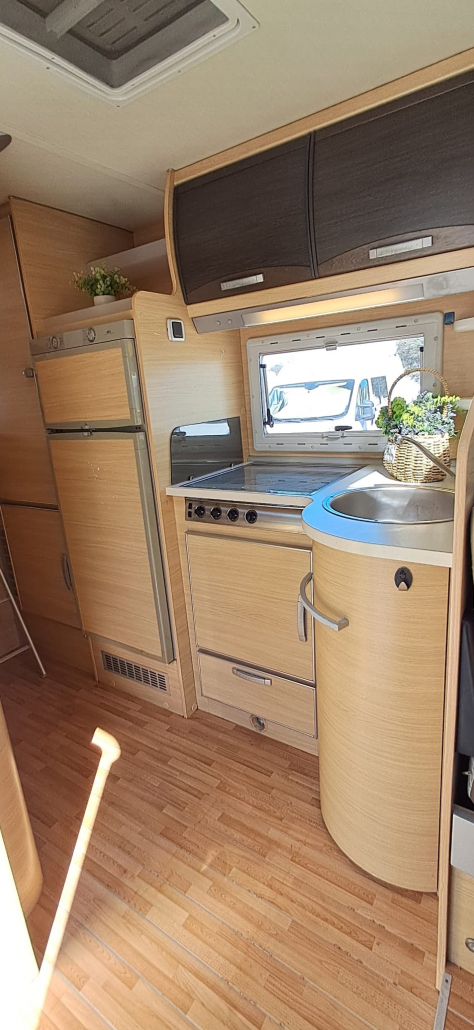 La zona de descanso está diseñada para garantizar confort, con camas amplias y soluciones prácticas de almacenaje. La cocina, totalmente equipada, cuenta con fuegos, fregadero y frigorífico, permitiendo preparar comidas con total autonomía durante el viaje.