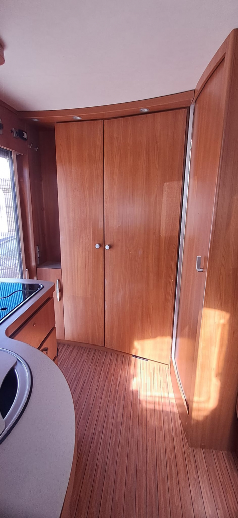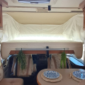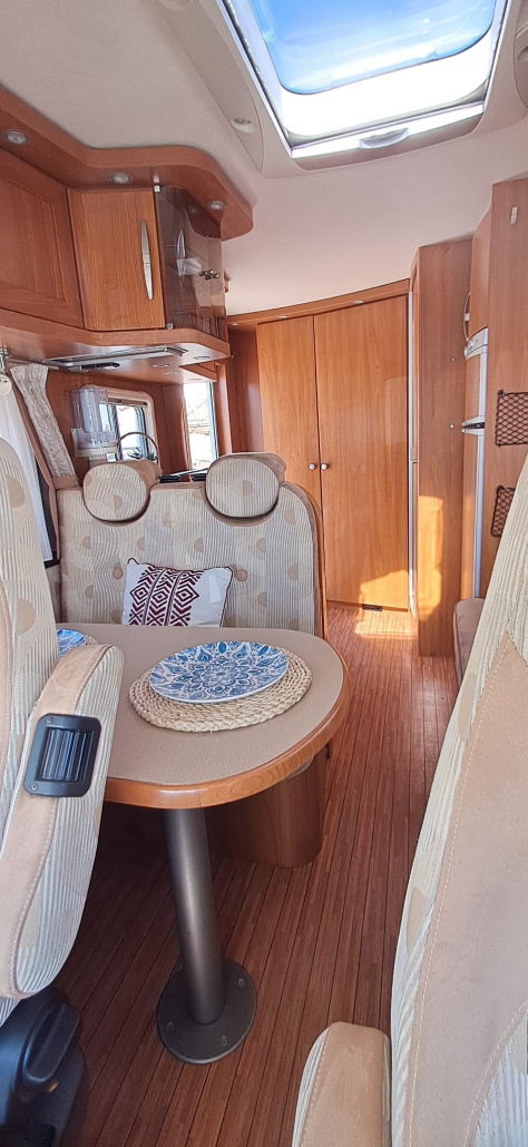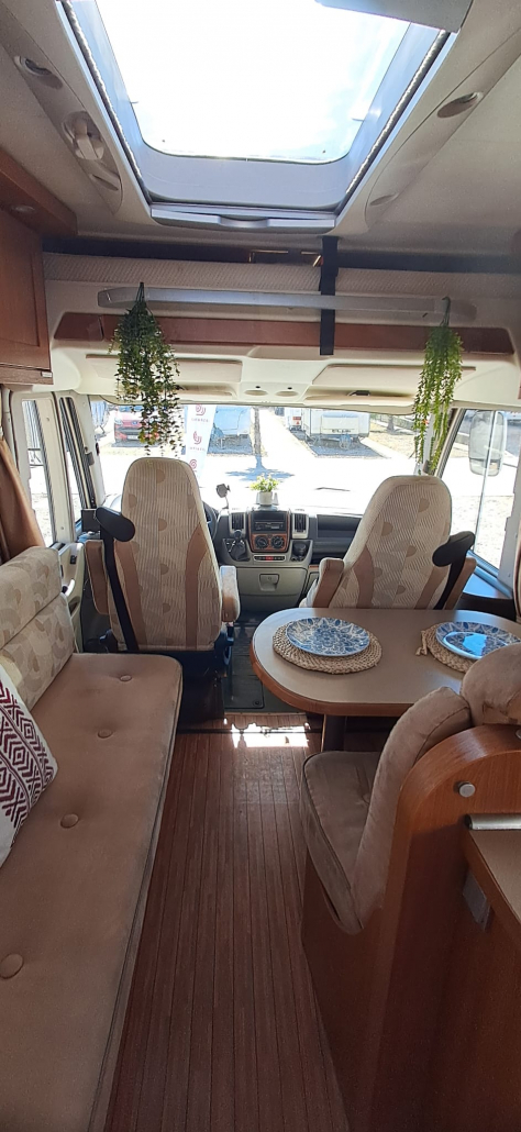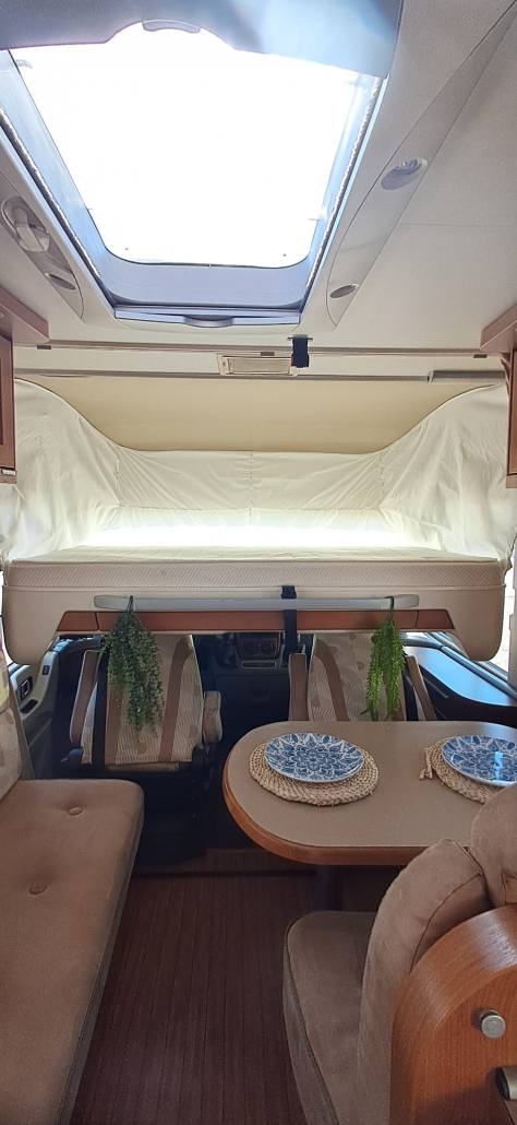 El vehículo ofrece una distribución cómoda y funcional. Dispone de cama basculante en la parte delantera, situada sobre la cabina, que se despliega fácilmente y permite aprovechar al máximo el espacio interior durante el día. El salón se beneficia de asientos delanteros giratorios con sistema Remis, que amplían la zona de estar y crean un ambiente más amplio y confortable.