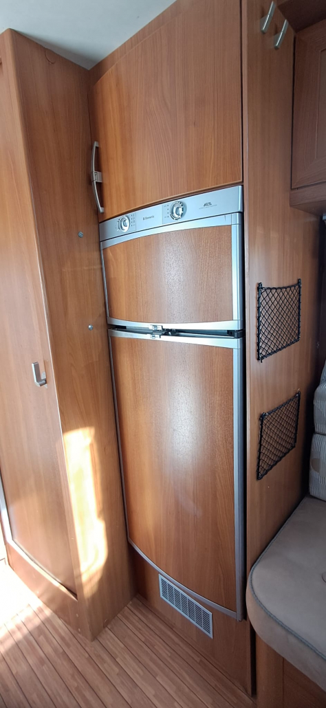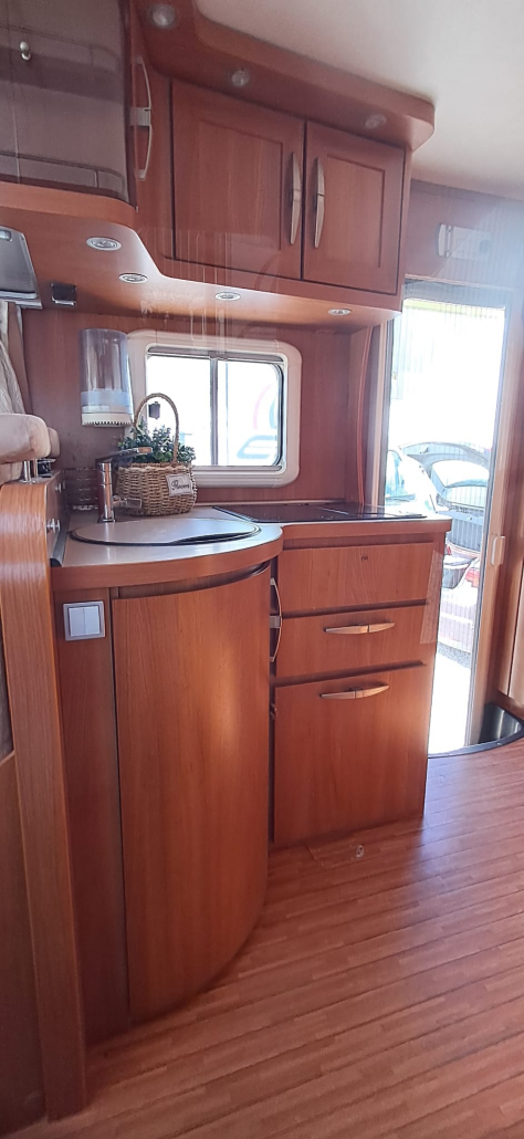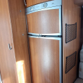 La cocina está diseñada para un uso práctico durante los viajes y cuenta con fogones de gas para preparar comidas, además de un frigorífico grande trivalente, que puede funcionar a gas, 12 V o 220 V, ofreciendo gran capacidad de almacenamiento y autonomía en diferentes situaciones de viaje.