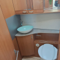 La cocina está equipada con fregadero y cuenta con amplios cajones y espacios de almacenamiento, pensados para un uso práctico durante los viajes. El cuarto de baño dispone de ducha y WC separados, aportando mayor confort e independencia en el uso diario.
