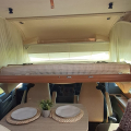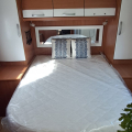 Al acceder al interior, encontramos un salón amplio y luminoso, con asientos delanteros giratorios que optimizan el espacio de convivencia. La zona de descanso cuenta con una confortable cama isla, ofreciendo fácil acceso y gran comodidad.