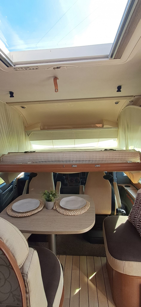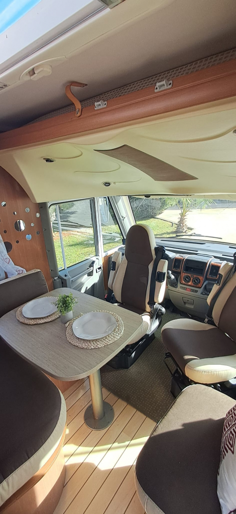 Al acceder al interior, encontramos un salón amplio y luminoso, con asientos delanteros giratorios que optimizan el espacio de convivencia. La zona de descanso cuenta con una confortable cama isla, ofreciendo fácil acceso y gran comodidad.