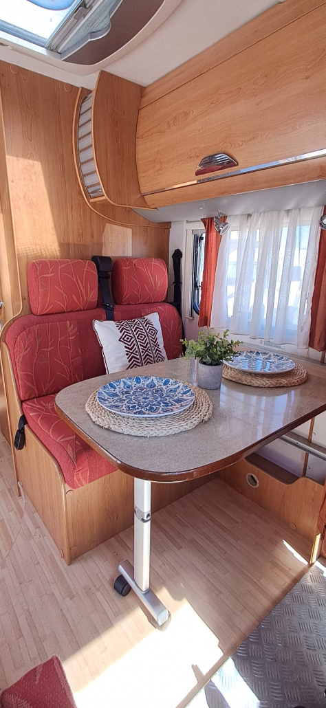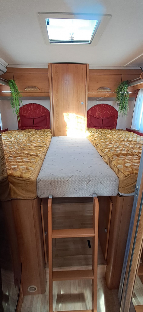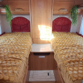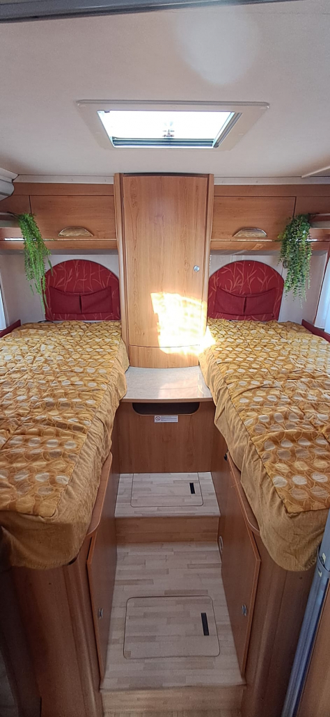El vehículo ofrece dos camas gemelas en la parte trasera, una distribución muy cómoda que permite un acceso sencillo a cada cama y mayor confort durante el descanso. Además, la autocaravana dispone de 4 plazas homologadas para viajar y dormir, lo que la convierte en una opción ideal tanto para parejas como para familias.