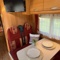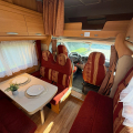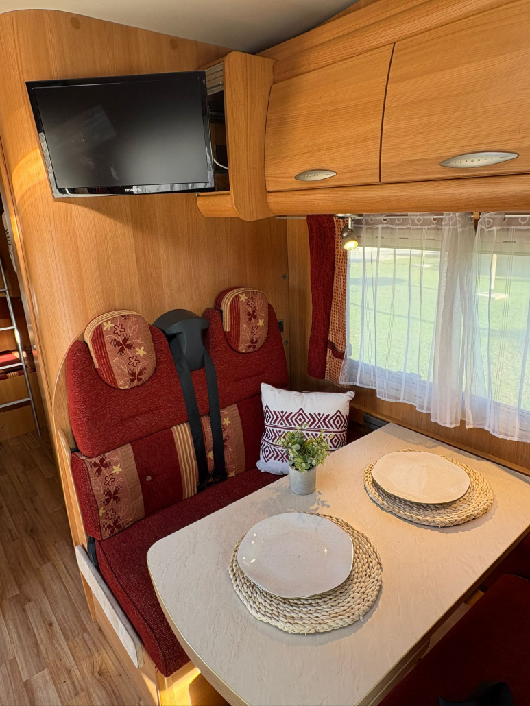 Cuenta además con aire acondicionado en cabina, sistema de calefacción, antena de televisión, placa solar y toldo exterior, lo que la hace ideal para estancias prolongadas y viajes en cualquier época del año. Su diseño interior espacioso y bien distribuido la convierte en una opción perfecta para quienes buscan confort y autonomía en sus escapadas.