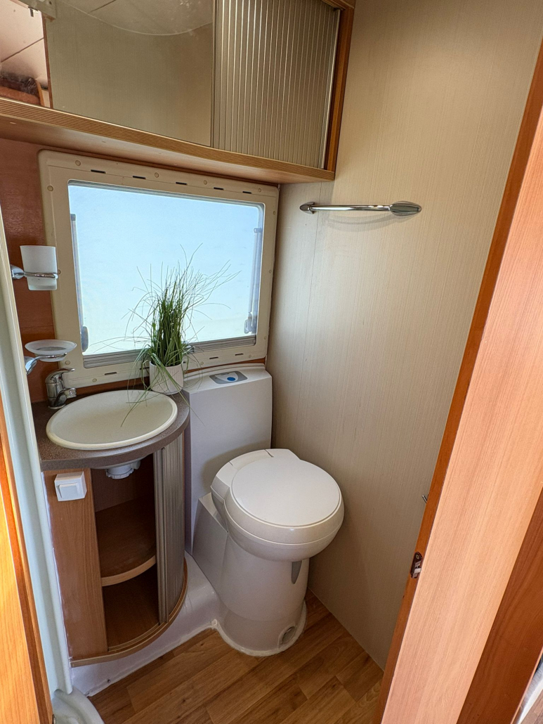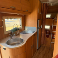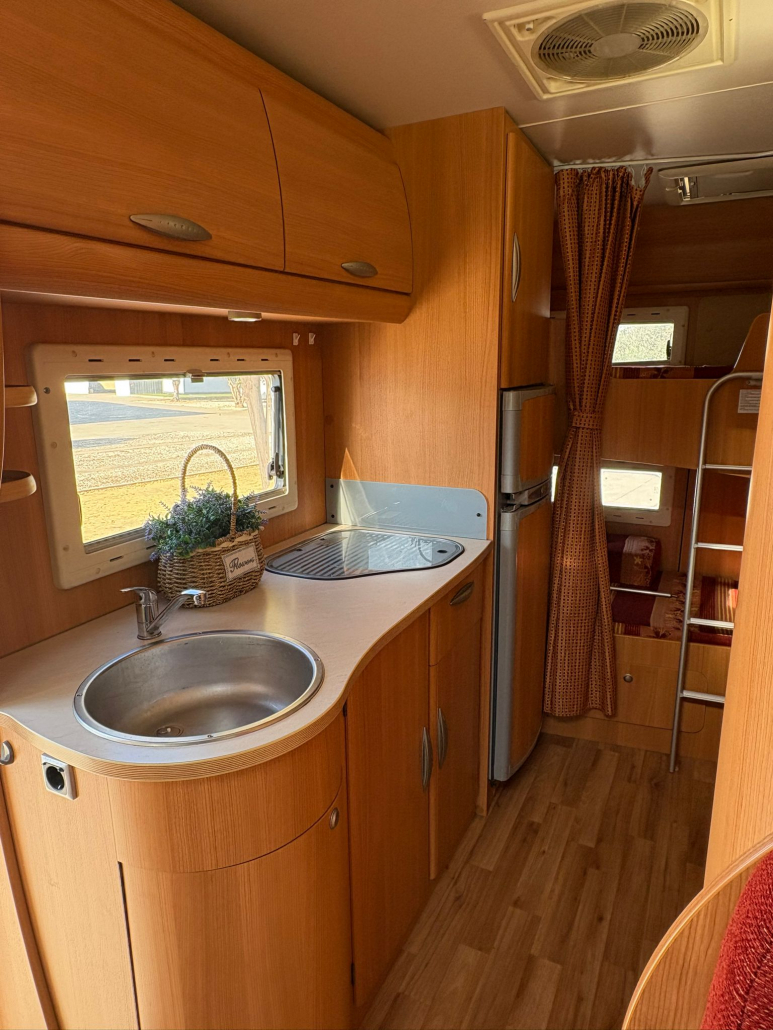 La cocina está totalmente equipada con un frigorífico trivalente de gran tamaño, fogones y fregadero, garantizando comodidad durante los viajes. El baño es funcional y completo, con ducha, lavabo y WC químico.