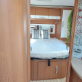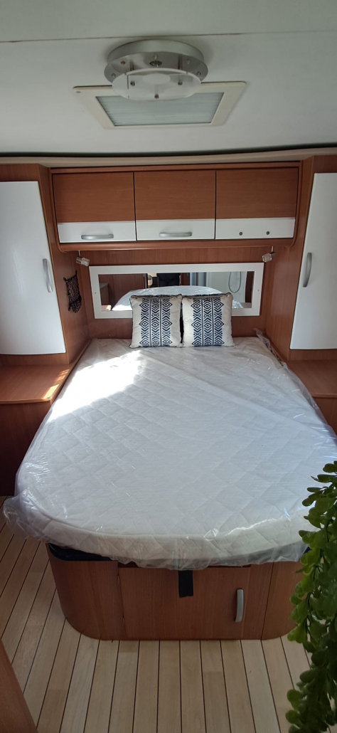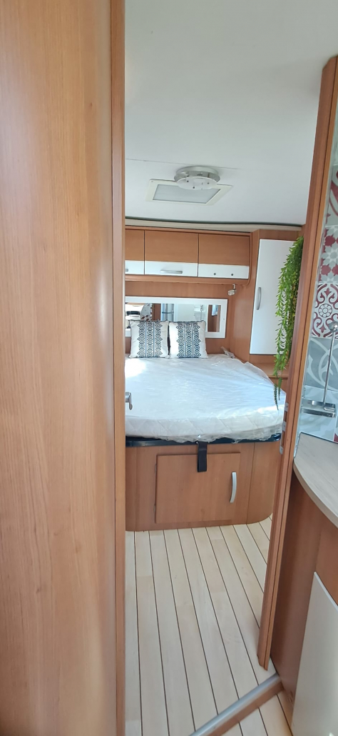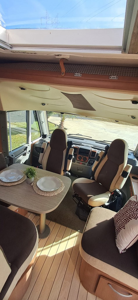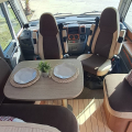 El interior destaca por su salón amplio y luminoso, con asientos delanteros giratorios que crean un espacio cómodo para la convivencia. La zona de descanso cuenta con una cama isla grande y confortable, con una distribución práctica que facilita el movimiento y el descanso.