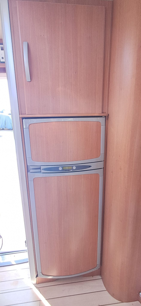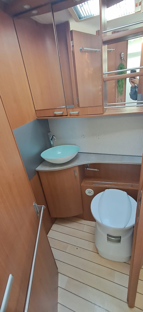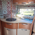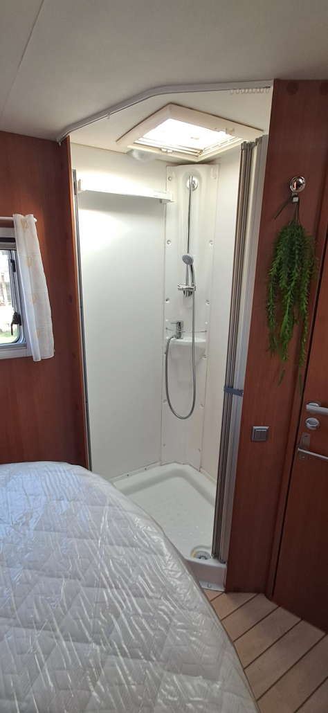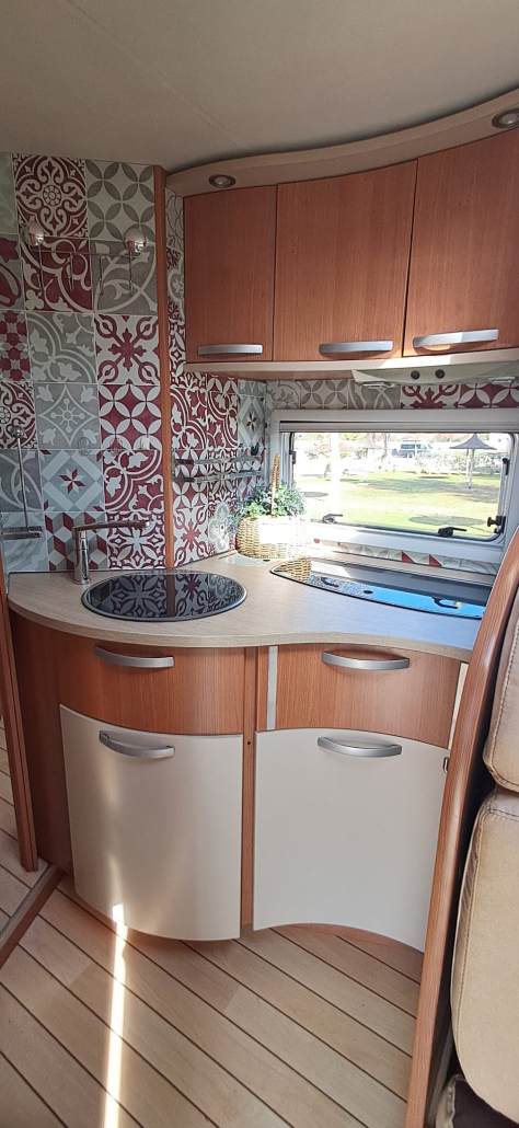 La cocina está totalmente equipada, con fregadero y amplios cajones y espacios de almacenamiento. El baño es completo, con ducha y WC separados, ofreciendo mayor comodidad e independencia durante los viajes.