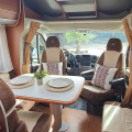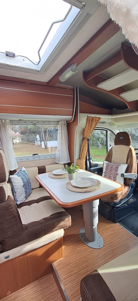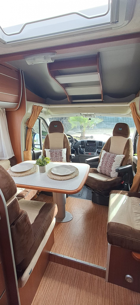 Salón espacioso con asientos delanteros giratorios, creando una zona de estar cómoda y funcional, perfecta para compartir comidas, juegos o momentos de relax.